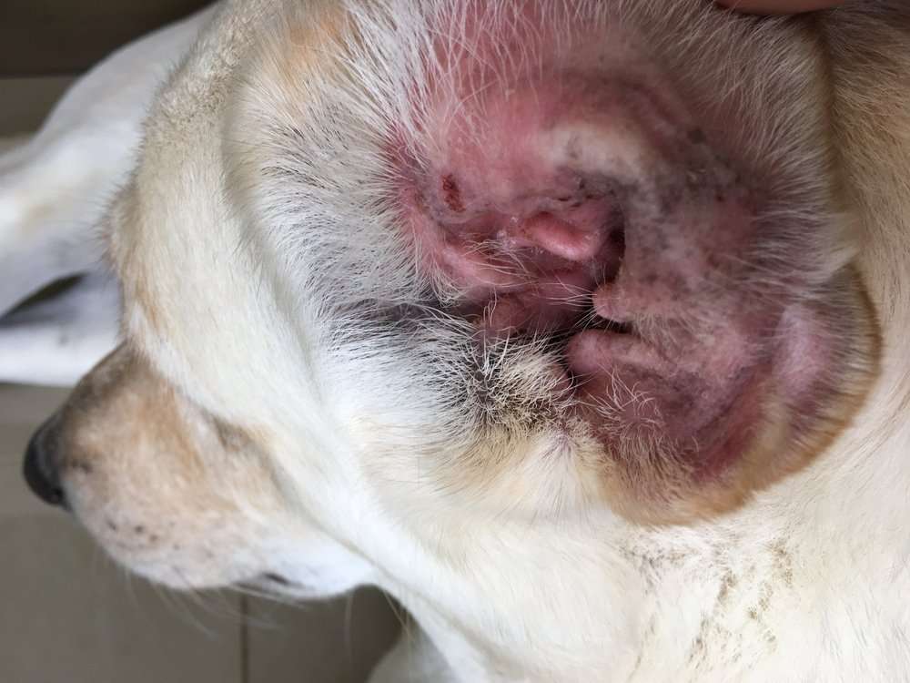 - Crusty, scabby or red, irritated skin inside the ear flap