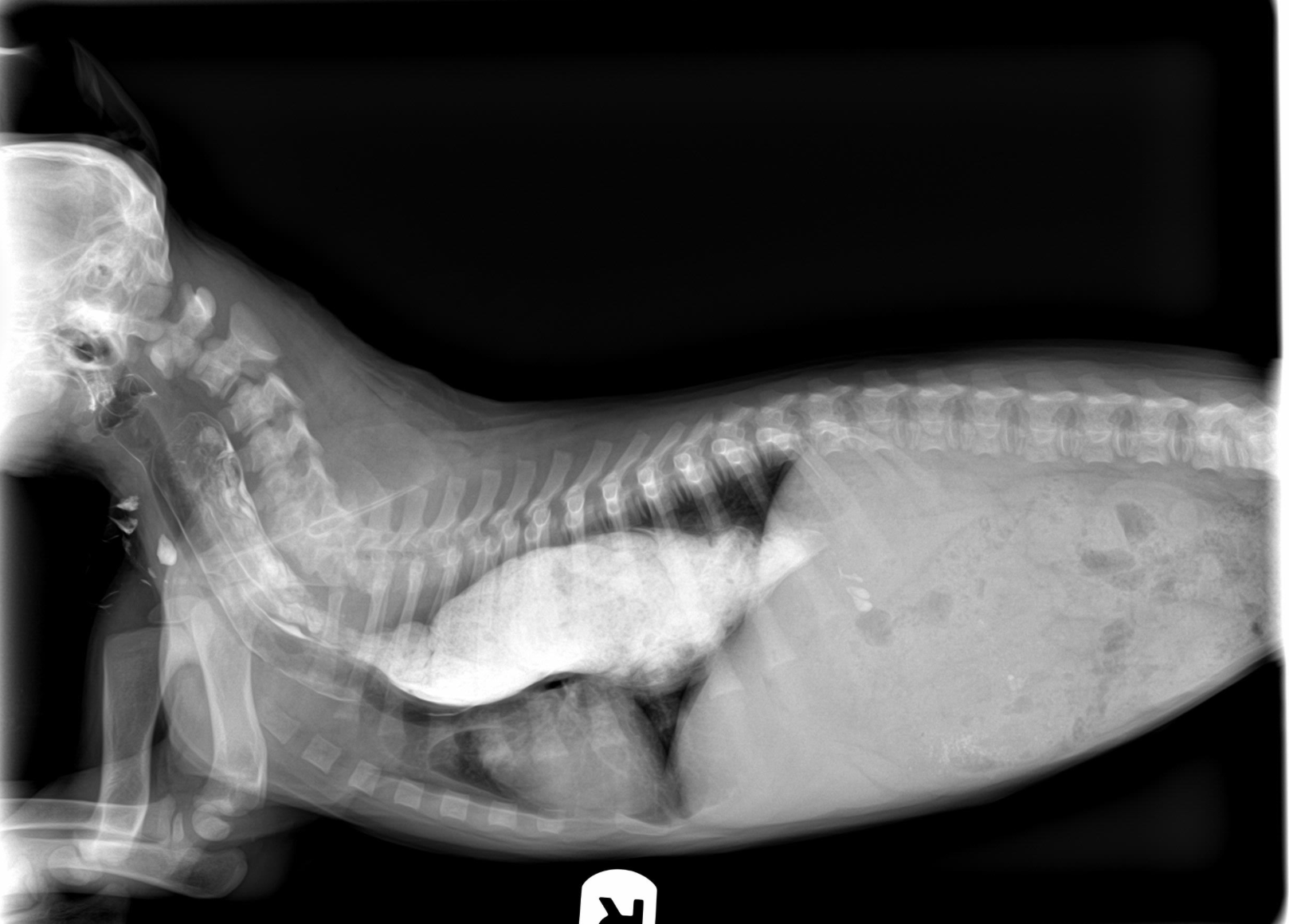 Diagnosis is made by radiographs of the chest. Sometimes positive contrast radiography (as seen below), esophagoscopy or fluoroscopy (real-time xray) may be necessary to make a definitive diagnosis in mild cases.